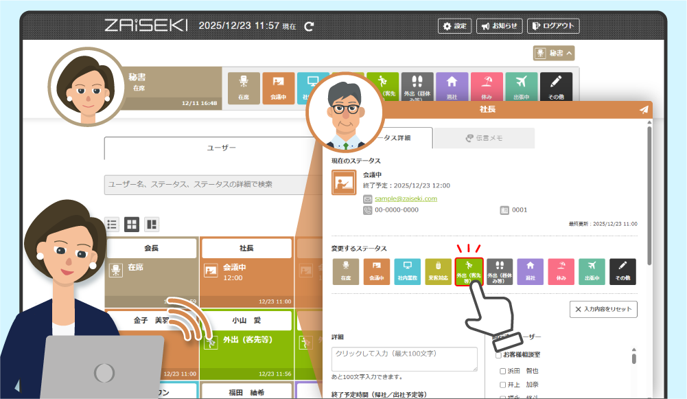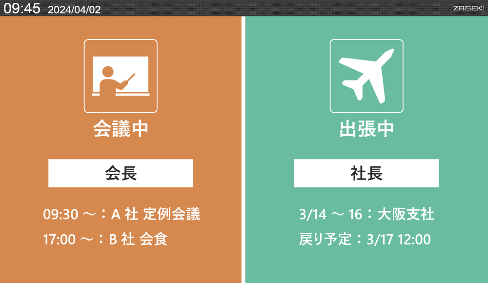 - リアルタイムで会長・社長の在席・外出予定を確認できるようになり、スケジュール調整や来客対応がスムーズに!